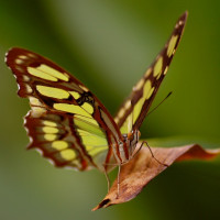 The image shows a butterfly with colorful wings, specifically featuring yellow and black patterns. It is perched on what appears to be a leaf, indicating it may be in a natural environment or perhaps even in a garden setting.