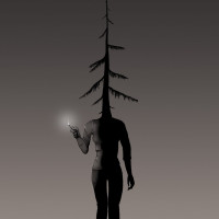 a pine tree, which is often associated with forests and nature. The overall tone of the image suggests a dark or nighttime setting, possibly during winter due to the presence of snow or icy ground.
