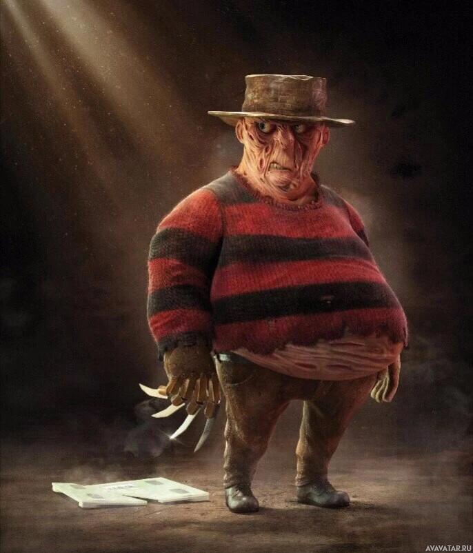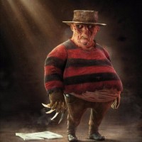 an animated character that appears to be a stylized version of Freddy Krueger, a well-known fictional character from the "Nightmare on Elm Street" film series. The character is depicted with exaggerated features and is shown holding a claw glove, which is