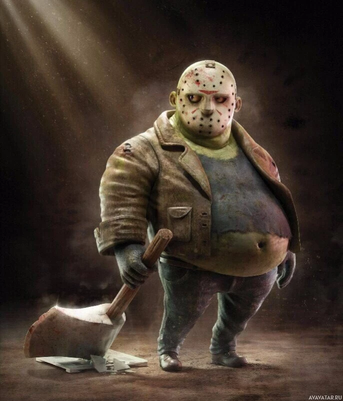 big eyes and a cheerful expression, wearing a jacket that resembles Jason's iconic hockey mask. The character is also holding what appears to be an axe in its hand, but the design has been exaggerated for