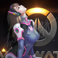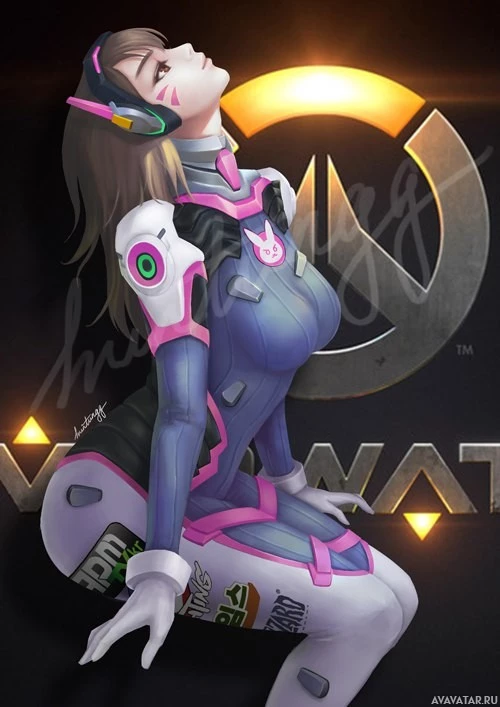 a dynamic pose with one leg raised as if she's either stepping forward or getting ready for action. In the background, there is an emblem that reads "Overwatch," indicating