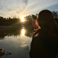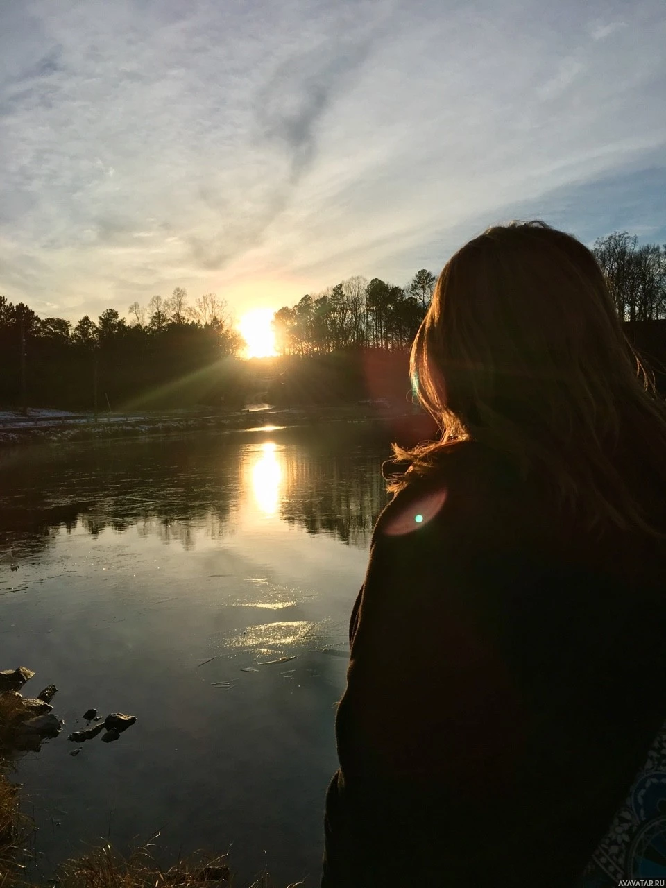 The picture features a person, from behind, observing the sunset on a river. The individual appears to be standing by the water's edge with trees and