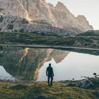 body of water reflecting the surroundings. To the right, there is a person standing near the water's edge, silhouetted against