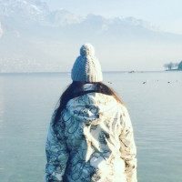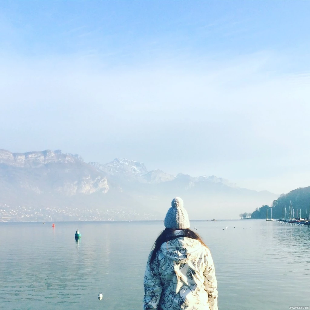 a body of water, looking out towards the horizon. The individual is wearing a jacket and a cap with earflaps, which suggests it might be cold or windy outside. In the background, there are mountains, indicating that this scene may be taking place near