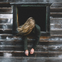 an old building with peeling paint and visible signs of age and decay. The most prominent feature in the image is the window she's leaning against. Her hand seems to be on the sill, and her posture suggests that she might be looking out from the window or resting against it.