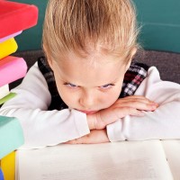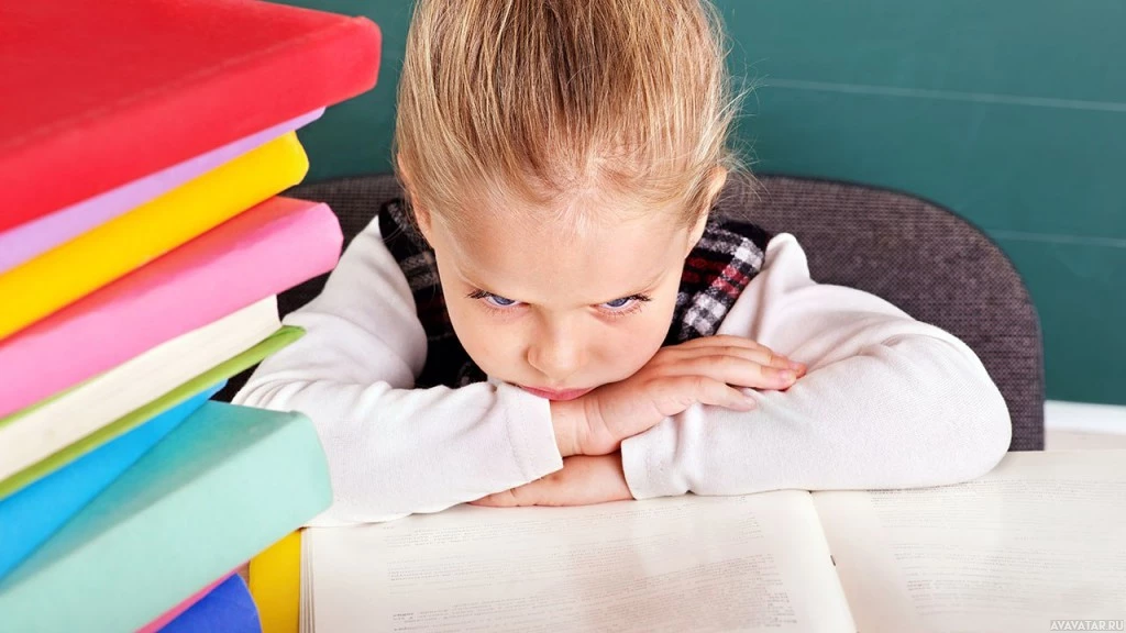 a thoughtful expression on her face and is resting her chin on her hands. The background includes what seems to be a classroom setting with