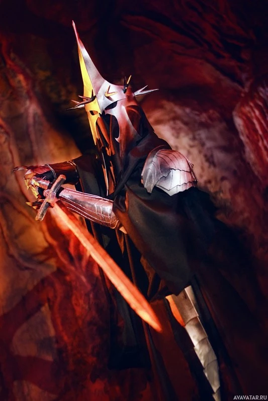 the Rings universe, standing in what appears to be a dark and menacing environment. This character is dressed in armor with a pointed helmet and is holding a sword, suggesting