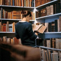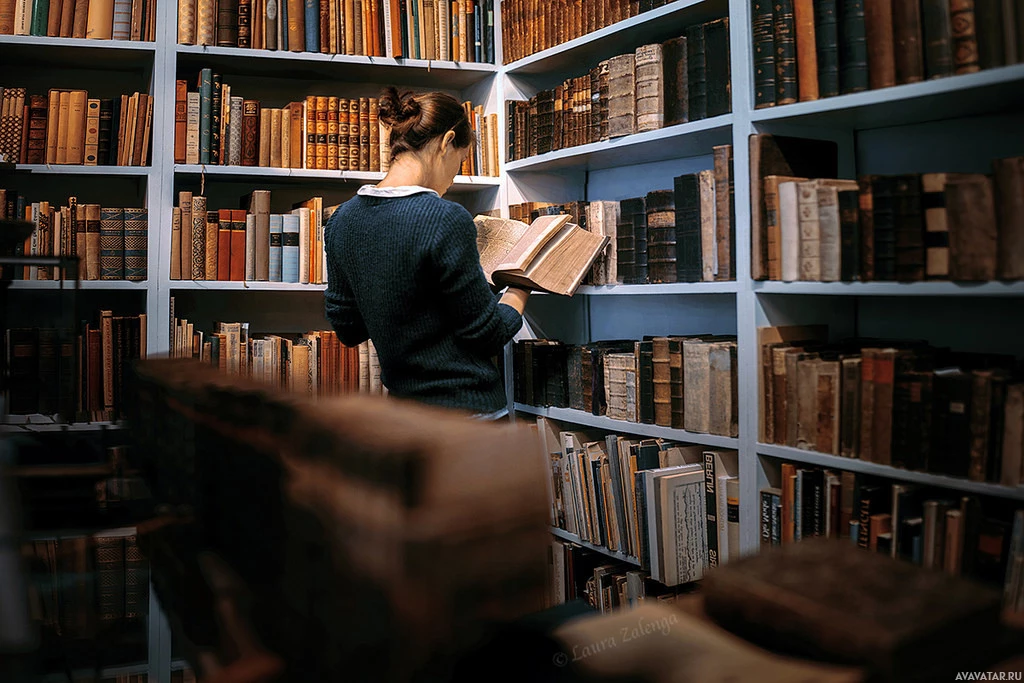 many books. The individual appears to be reading or examining one of the books. They are wearing a dark-colored sweater and their back is facing towards the camera, giving us a view from behind. The setting suggests that this could be a library or a personal