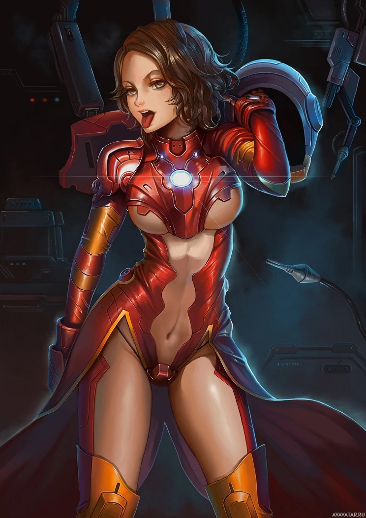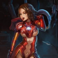 a female character wearing a suit that is reminiscent of the Iron Man costume. She has her hand on her hip and appears to be posing confidently. The artwork features a blend of sci-fi elements, such as circuit patterns and