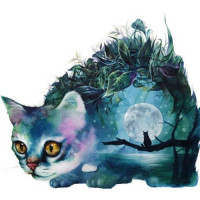 a night sky with a full moon visible on the right side. There are also trees and what appears to be a river or lake in the lower part of the image. The overall style suggests a fantastical or surreal theme, blending elements of nature with