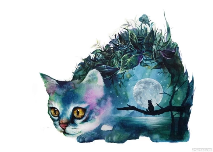 The image depicts a whimsical illustration of a cat. The cat has a vividly