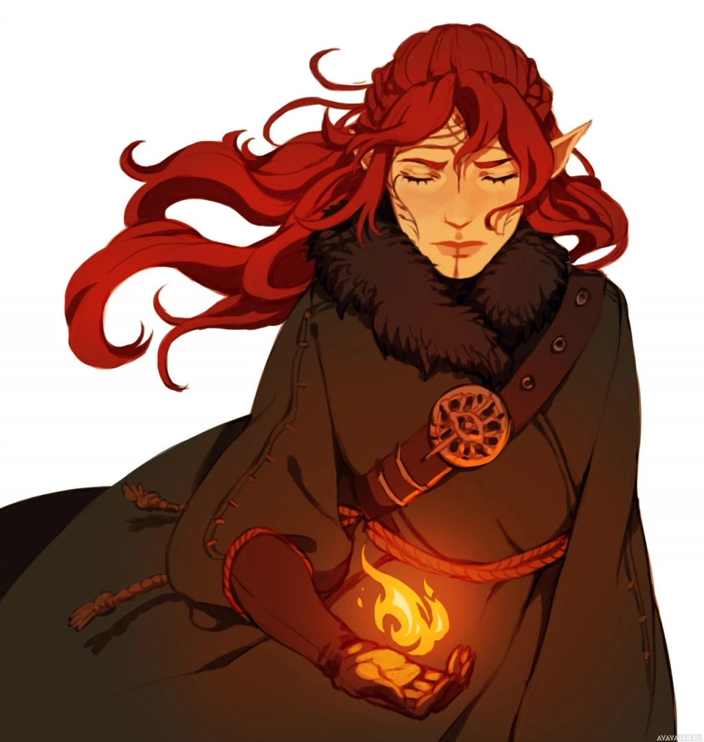 fantasy stories. The setting is not explicitly visible, but the character's attire and accessories suggest she could be in a forest or wilderness typical of