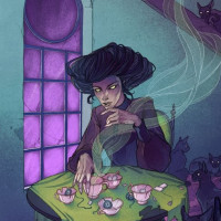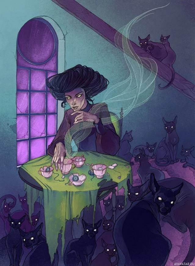 black cats, which might suggest the presence of familiar spirits, common in witchcraft and magical traditions. The setting appears to be an interior space with a dark,