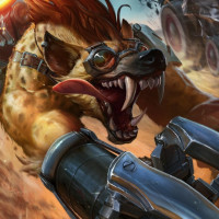 The image depicts a fantasy-themed scene featuring two characters. On the left, there is an anthropomorphic cheetah with exaggerated features such as