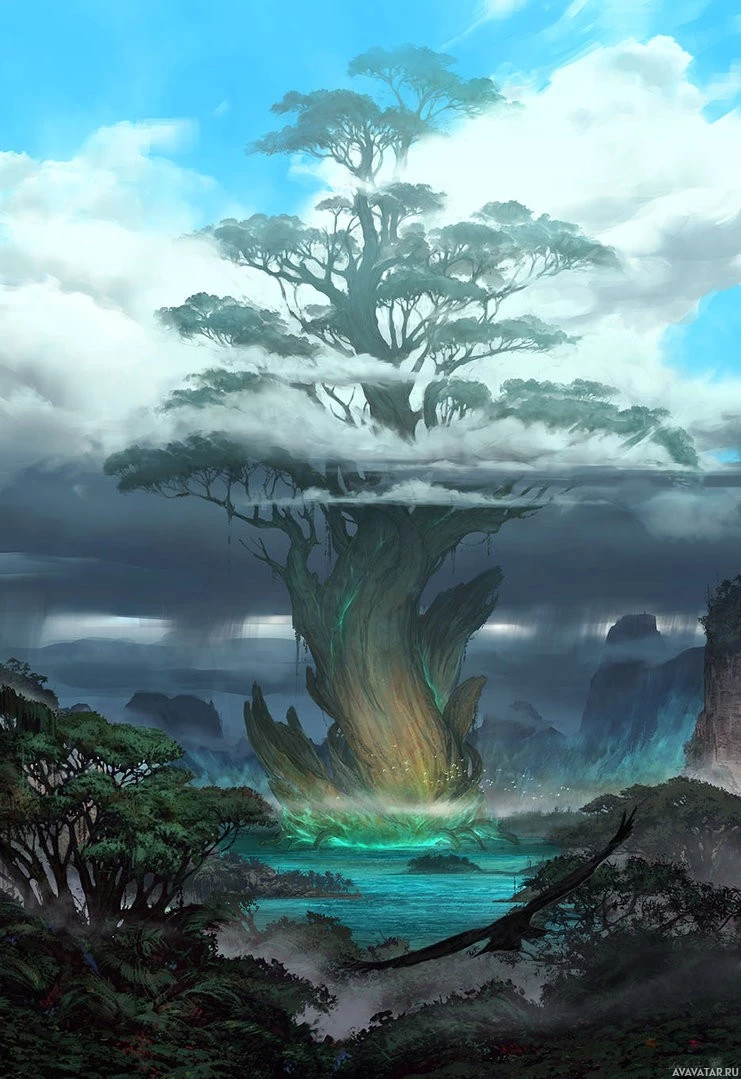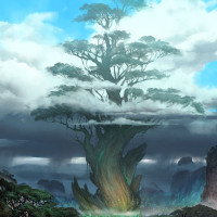 a fantastical landscape where a tree is prominently displayed. This tree stands out with its large canopy and