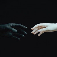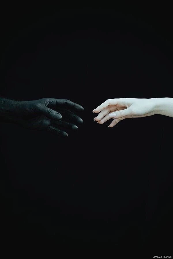 a stark contrast in color between the two halves of the image, with one side featuring a dark and moody color scheme, possibly indicating a sense of separation or isolation, while the other half has a lighter, more hopeful tone. The hands themselves are pale-colored, which stands out against