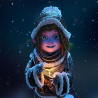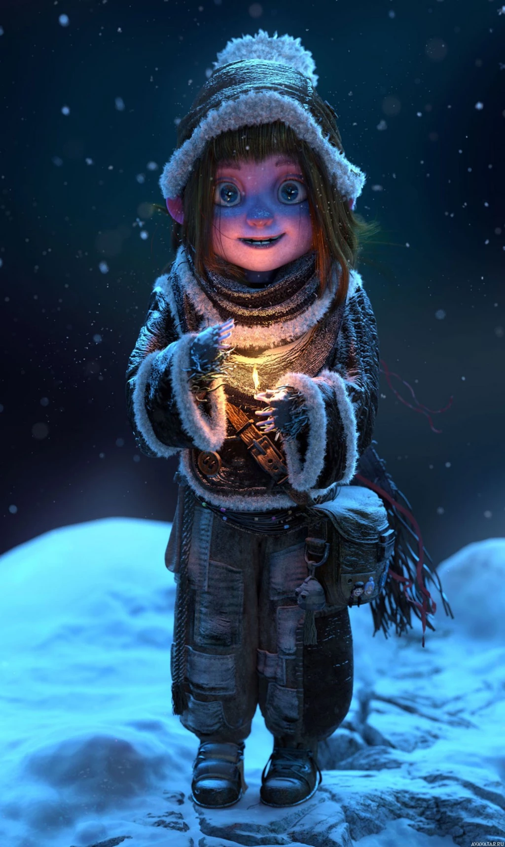 the snowy environment and the darkness around. The child is dressed in warm clothing suitable for