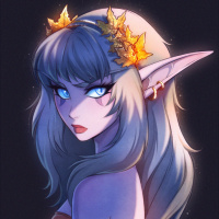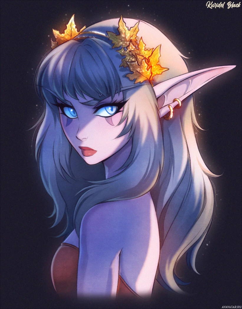 white hair, wearing a crown adorned with leaves. The character has pointed ears and is looking to the side with a slightly displeased or stern expression on her face. Her outfit suggests she might be dressed for a formal or ceremonial occasion. This image could be associated with fantasy genres such as