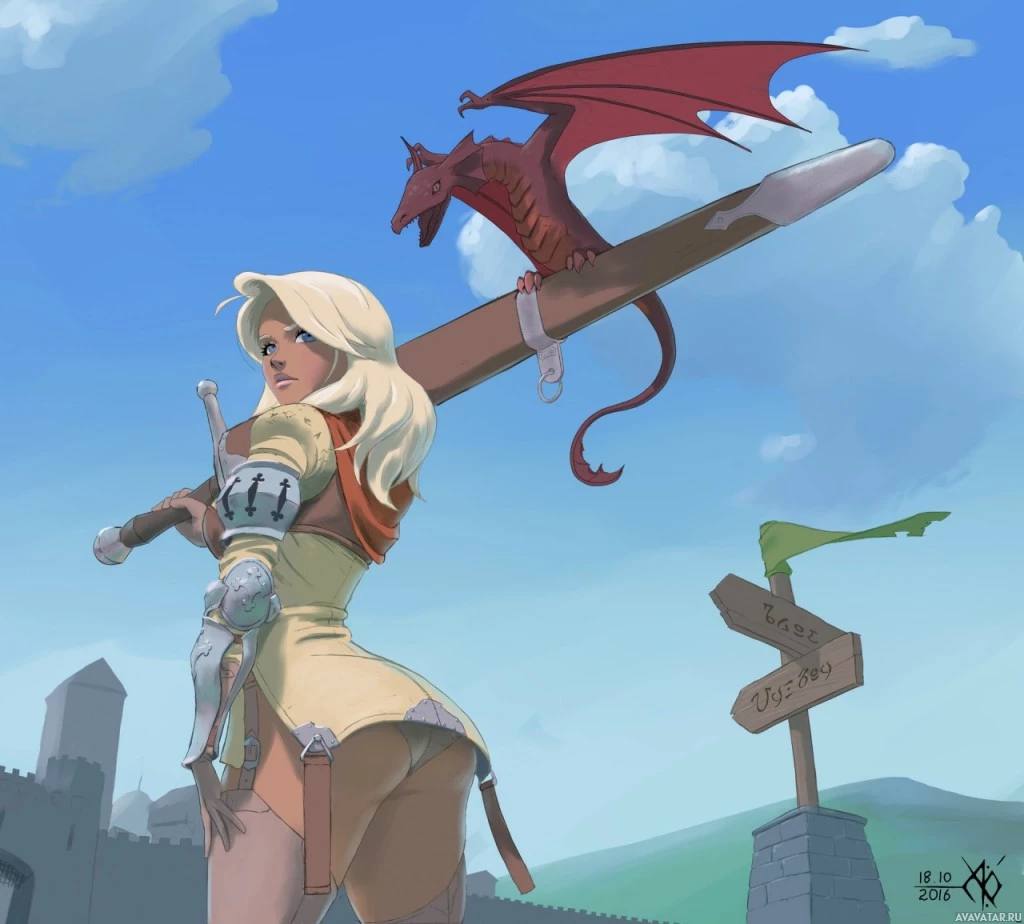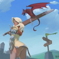 a female character with blonde hair, wearing armor and holding a large sword. She is positioned against