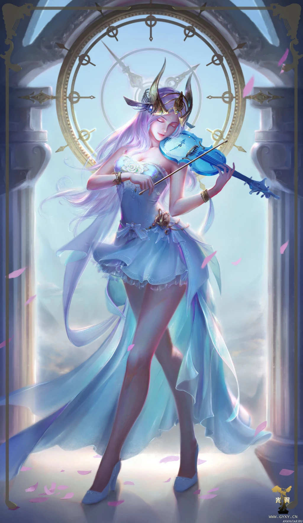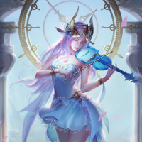 a fantasy character, specifically a female musician with purple hair. She is holding a bow and playing an instrument that appears to be a violin or a similar stringed