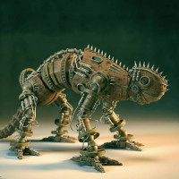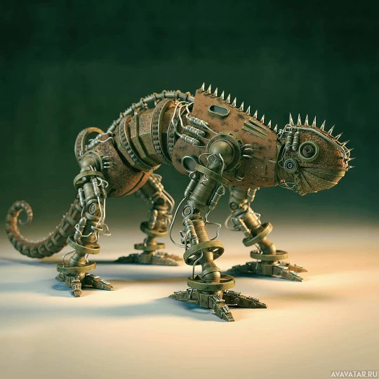metallic parts such as pipes and cogs, along with spiky structures that mimic the iguana's natural armor or scales. It is