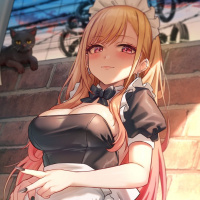 На картинке изображен анимированный персонаж Марин Китагава из аниме «Истребитель Гоблин». Она изображена в наряде чёрной горничной и стоит одной рукой на бедре, небрежно прислонившись к кирпичной стене. Кошка видна с левой стороны рамы, расположенной поверх того, что кажется велосипедом или мотоциклом. Обстановка предполагает городской переулок при дневном свете.