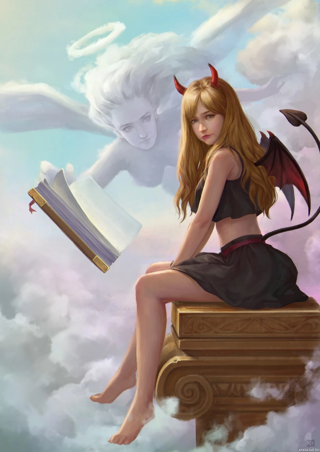 blonde hair and is wearing what appears to be a demonic or devilish costume with horns on her head, suggesting that she might be portraying a demonic figure. The girl is sitting on an ornate stool in the clouds, reading a book. Above her, there's an angel-like figure looking down at her with