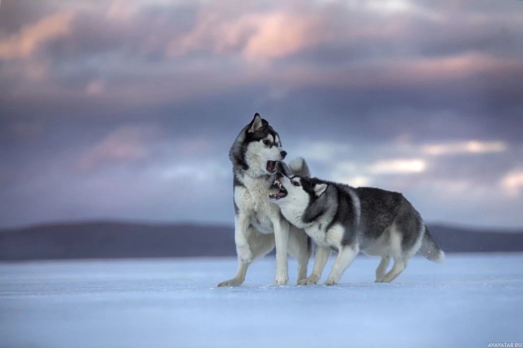 thick coats and erect ears, typical of husky breeds. They appear to be engaged in playful activity or interacting with each other in