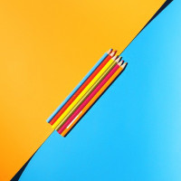 the color blocks and lines that suggest a graphic design context. The pencil is surrounded by what looks like colored paper or cardstock with
