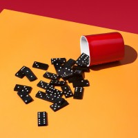 a yellow surface that contrasts with the red and black color scheme of the card and cup. This arrangement creates a visually striking image that might suggest themes of gaming or luck.