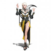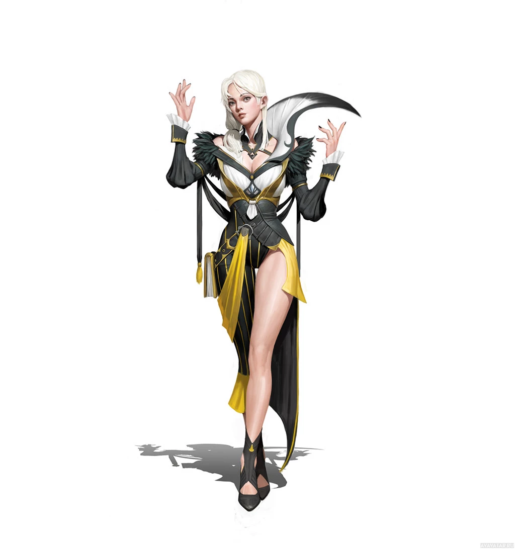 a female character with white hair. She is wearing a fantasy-style outfit that includes black and yellow elements, along with some