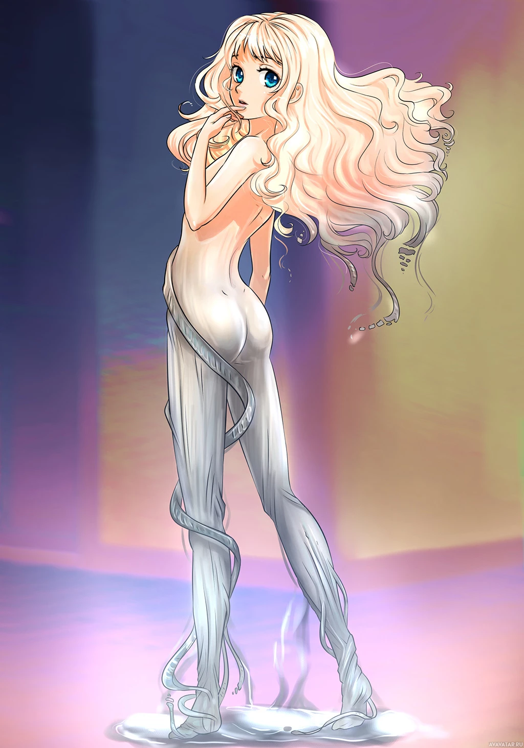 sort of power or ability related to water or light. Her pose and attire suggest that she might be a warrior or a heroine in