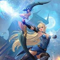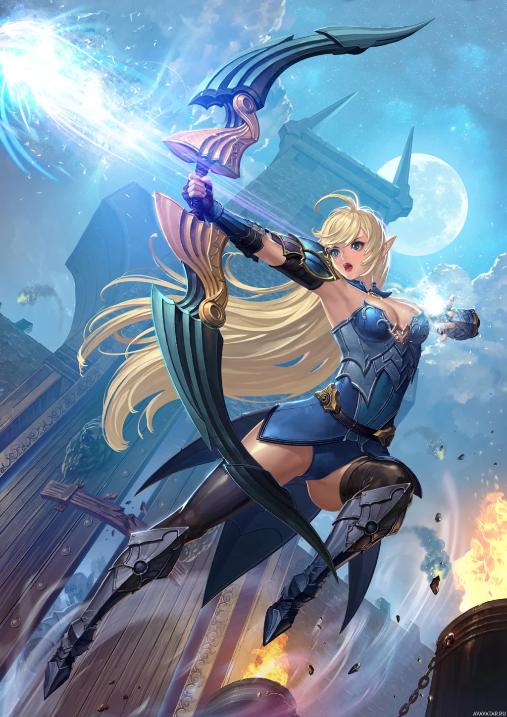 blonde hair and is wearing blue armor with gold accents, suggesting she might be a hero or warrior of some sort within this fantasy setting. The background depicts a night sky and what looks like an ancient ruin, indicating that the scene might be taking place in a mythical or historical location within