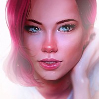На картинке изображена молодая женщина с розовыми волосами и голубыми глазами. Ее макияж хорошо сделан, подчеркивая ее особенности и добавляя к общей стилизованной внешности. Она обладает уверенным взглядом и, кажется, находится перед мягким, размытым фоном, который предполагает мечтательную или художественную атмосферу.