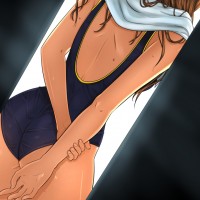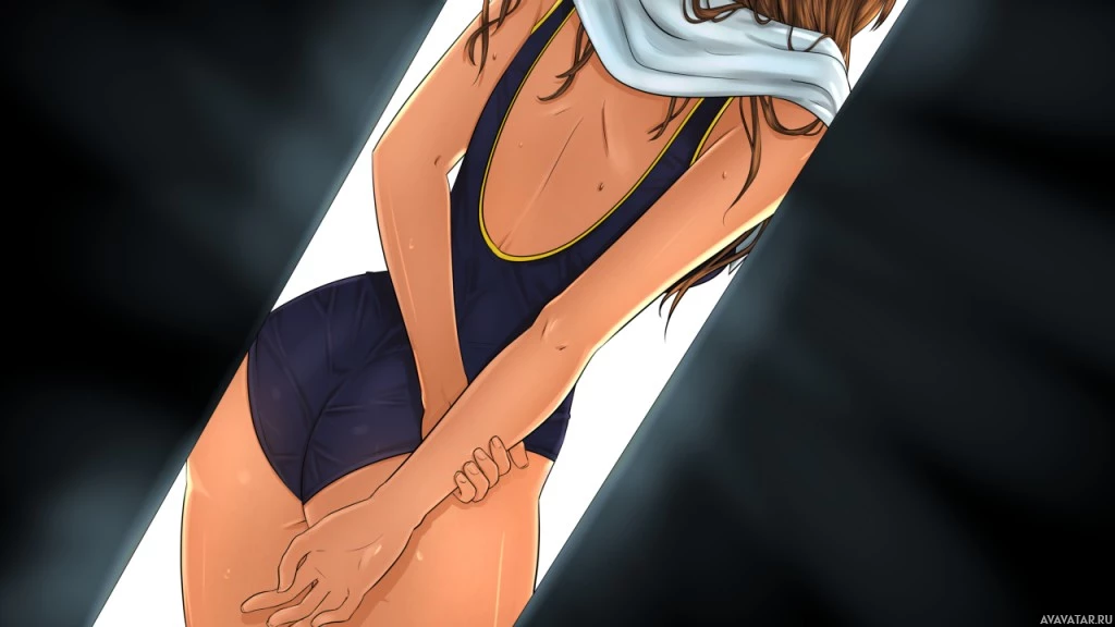 an animated character, a girl from behind. She is wearing a dark swimsuit and appears to be in a setting with a bright