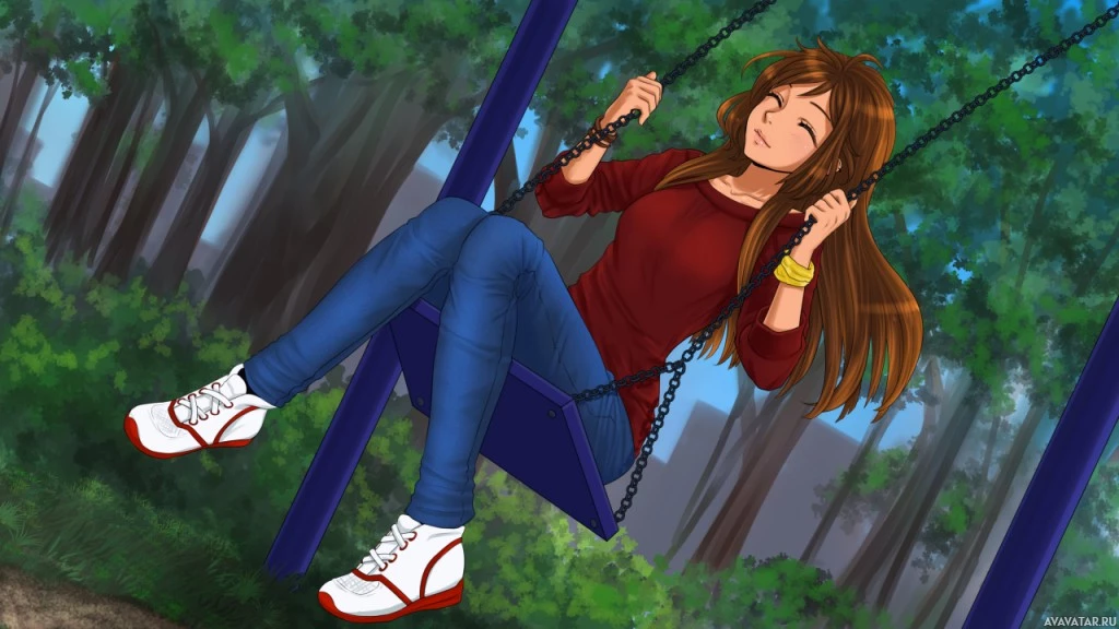 a red top and blue jeans, smiling as she swings the swing. The background suggests