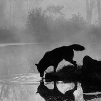 The image shows a silhouette of an animal, which is identified as a fox. The fox appears to be drinking water from the calm surface of a body of water. The reflection of the fox can be seen on the water's surface. The background is misty and seems to suggest that this scene is taking place during dawn or dusk due to the soft light. The overall atmosphere of the image conveys a serene, natural setting.