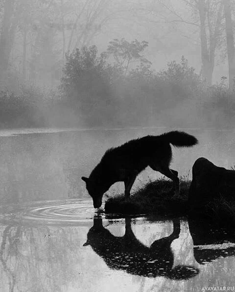 На картинке изображен силуэт животного, которое идентифицируется как лиса. Лиса, по-видимому, пьет воду со спокойной поверхности водоема. Отражение лисы можно увидеть на поверхности воды. Фон туманен и, кажется, предполагает, что эта сцена происходит во время рассвета или заката из-за мягкого света. Общая атмосфера изображения передает безмятежную, естественную обстановку.