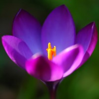 The image features a single purple flower with its petals gently curled around the center, revealing a small yellow center. This type of flower is commonly known as a tulip or crocus.