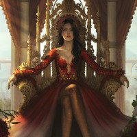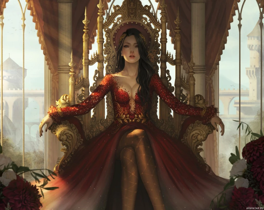 red dress with intricate gold accents, which suggests she might be of high status or importance within the context of this scene. Her hair is long and dark, and she has a calm yet confident demeanor as she gazes towards the viewer. The throne itself has ornate details, indicating that it is likely part of a ceremonial or symbolic event. In the foreground, there are red roses on either side of her, adding to the grandeur of the setting and suggesting a celebration or