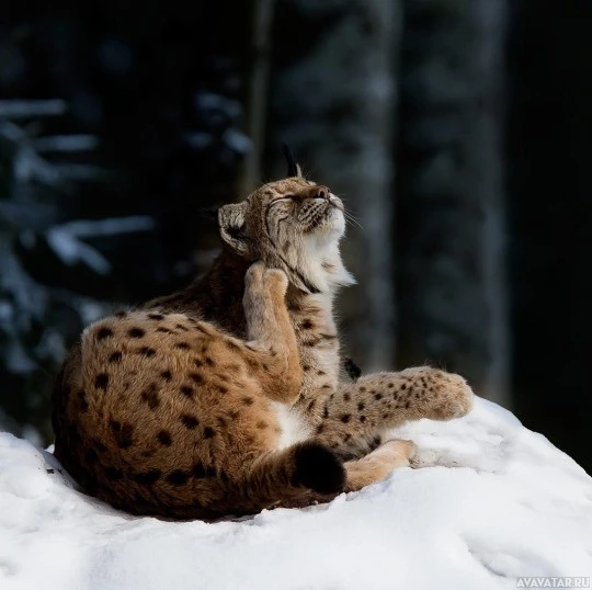 На картинке изображена рысь, сидящая в снегу с лапой, близкой к рту, возможно, ухаживающая за собой. Он расположен на фоне зимних деревьев и ясного неба.