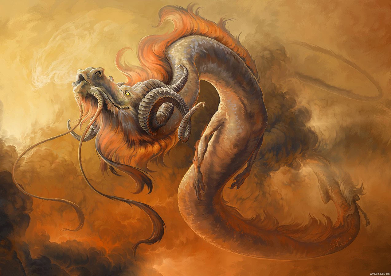 the center of the composition, with its body coiled and undulating in an anthropomorphic manner. It has a fiery appearance, with flames visible around its head and neck, suggesting it may be breathing or producing fire. The dragon appears to be riding a cloud or smoke-like formation that extends from the bottom of the image towards the top. This gives the impression that the dragon is soaring through the sky or descending from a higher location. The background is dominated by