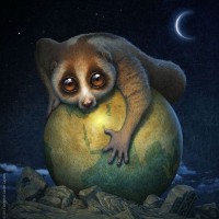 The image depicts a lemur holding onto the Earth. The lemur appears to be looking up at