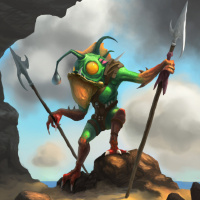 a fantasy creature known as a murlock. It has the body and lower face of a frog with large,