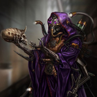 a purple robe that has a flowing appearance, suggesting movement or action. The character is wearing a skull as part of their attire, which could imply themes of mortality or macabre elements within the narrative they belong to. The setting looks like an industrial or dystopian environment with a dark ambiance and metallic structures that could suggest