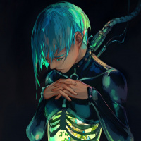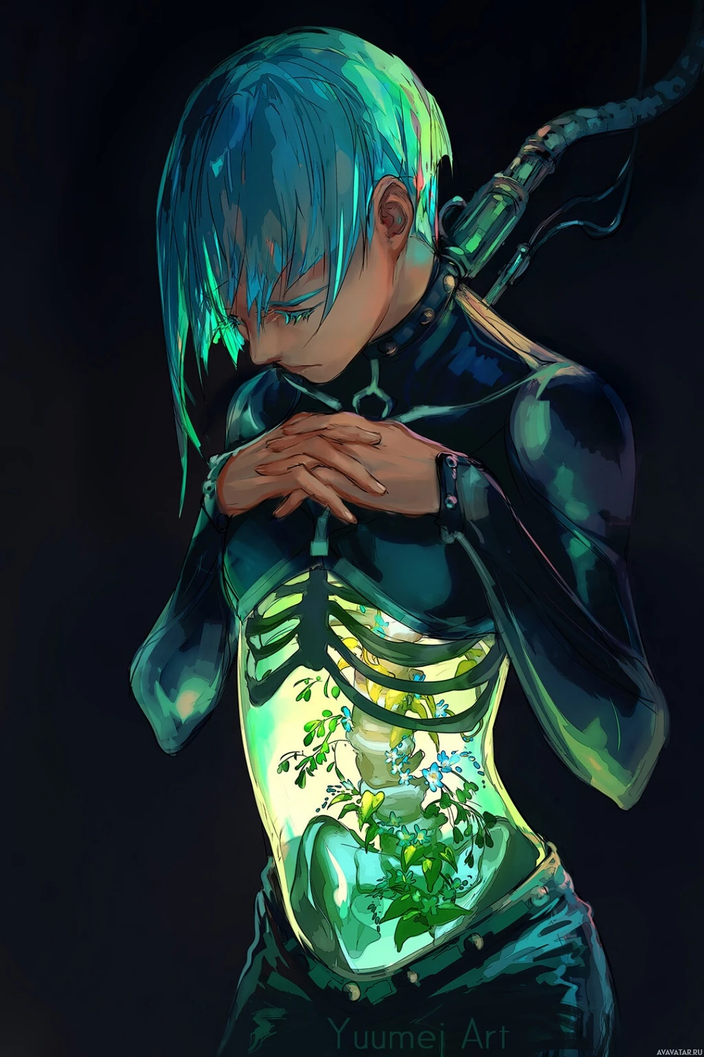 plant life growing inside the character's torso, which adds a surreal and possibly symbolic element to the image. The overall atmosphere of the artwork is dark and moody, with the use of color creating a striking contrast between the character's