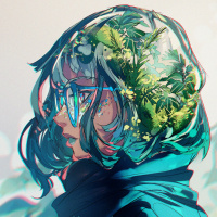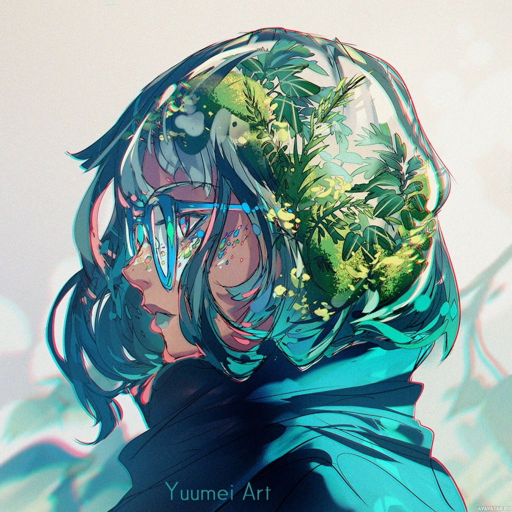lush greenery and various plant species. The background features abstract elements that could be interpreted as water or clouds, adding to the surreal quality of the image. It's