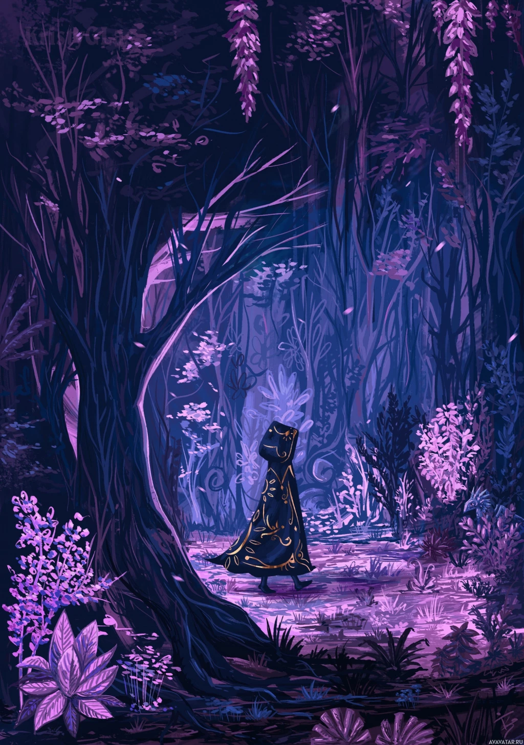 a character in the center, appearing to be looking at something or someone off-frame with their back turned towards the viewer. The character is wearing a cloak and has a hood that obscures their face. Surrounding the figure are various plants and trees, some of which have purple leaves, adding to