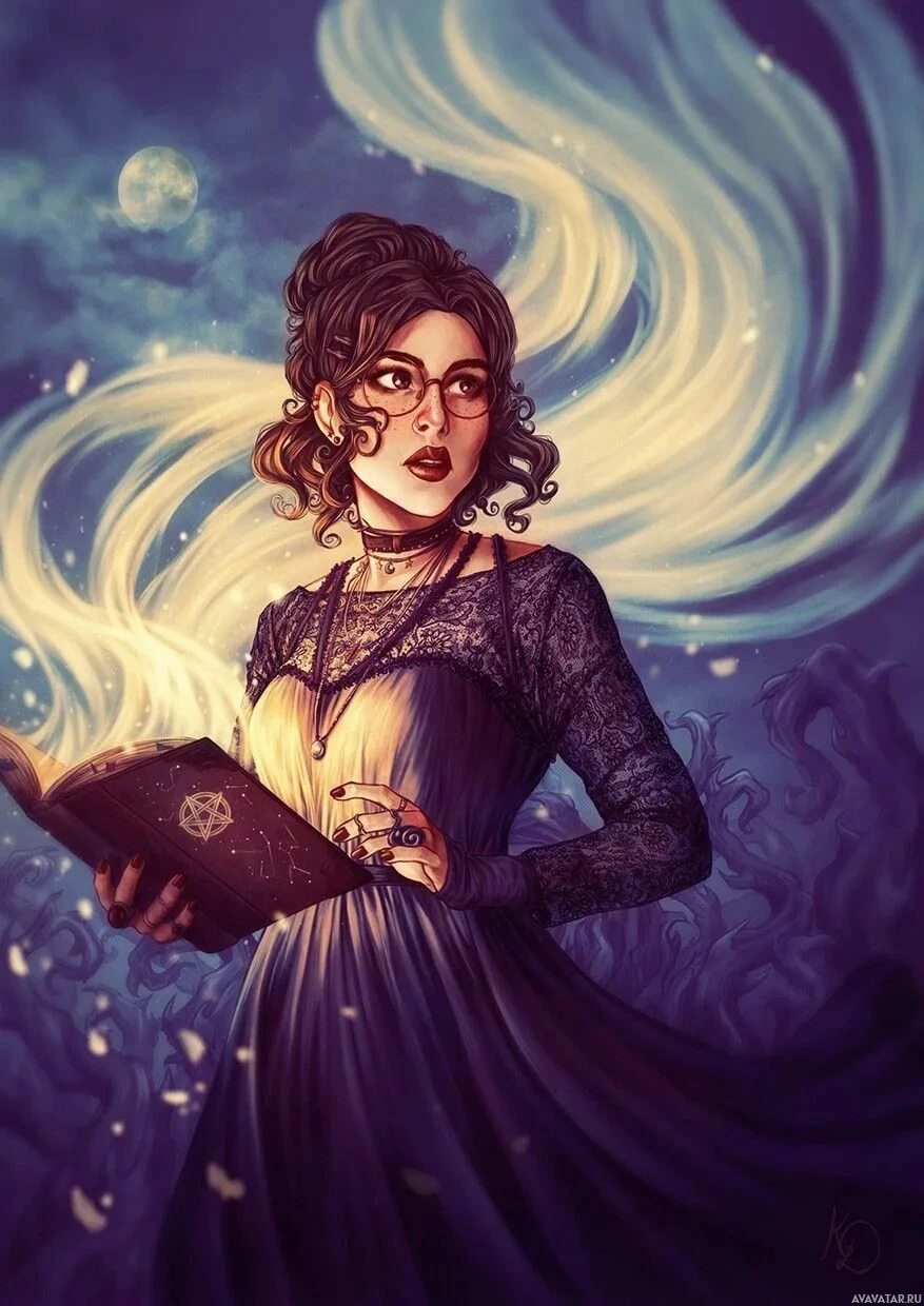 whimsical clouds and stars around her. The overall atmosphere of the image is one of enchantment and learning, with