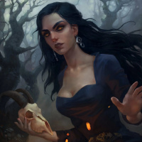 dark hair and pale skin. She is wearing what appears to be a corset or dress, and her expression is serious. In her hand, she holds a skull, which is often associated with symbolism in